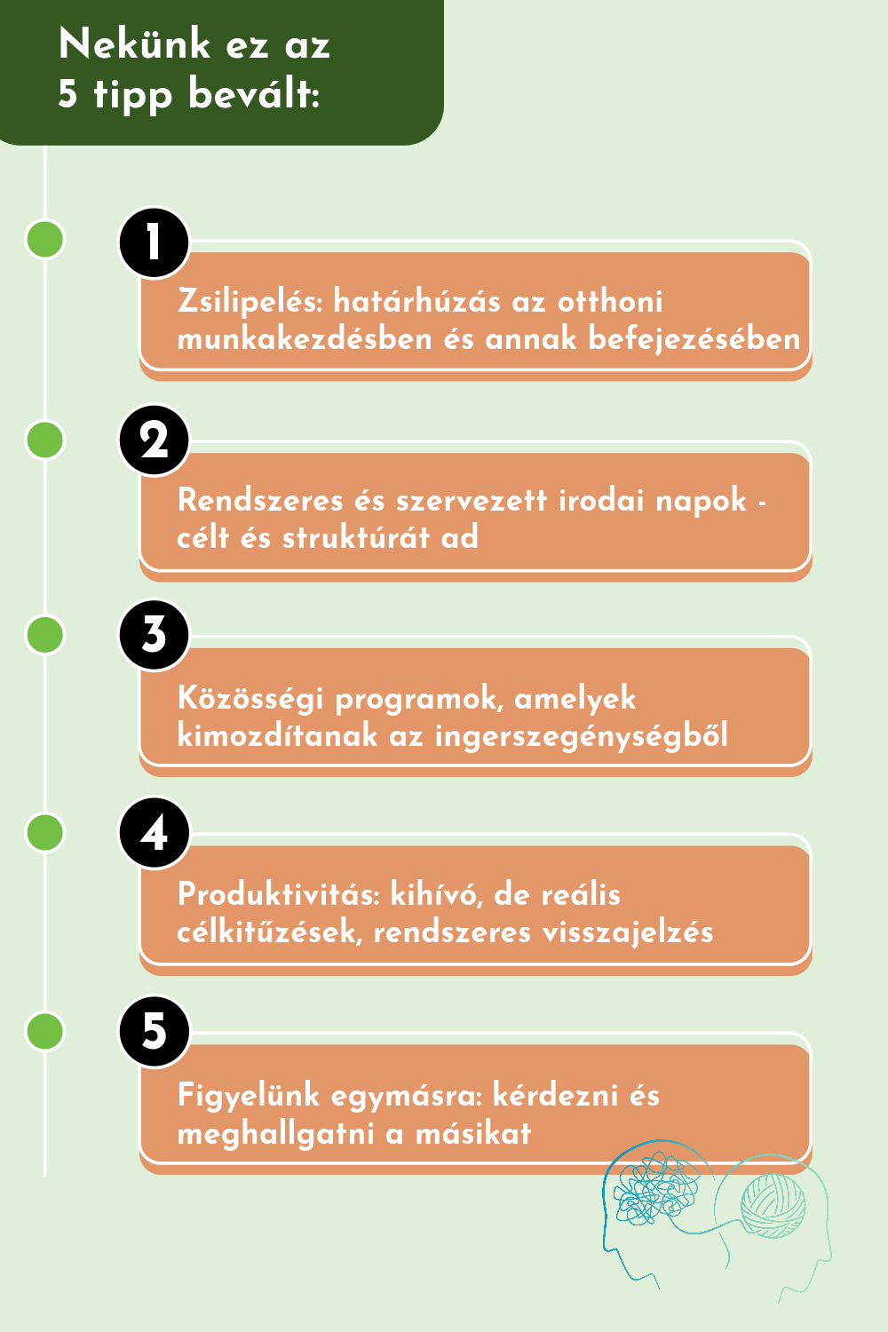 A munkavállalók és a munkáltatók is komoly fejlődésen mentek keresztül, hiszen nem csak folyamatokat, rendszereket kellett megalkotni az eredményes otthoni munkavégzéshez, hanem meg kellett tanulni másképp értelmezni a bizalmat, másképp vezetni a csapatokat, új módon kapcsolódni és együttműködni. A vezetőktől szélesebb eszköztárat hívott életre a hibrid lét: az online és offline tér váltakozása más lehetőségeket és nehézségeket takar. Munkavállalóként időt spórolunk azzal, hogy nem utazunk minden nap oda- vissza a munkahelyünkre. Tudunk koncentráltabban dolgozni, vagy épp rugalmasabban szervezni a teendőinket.