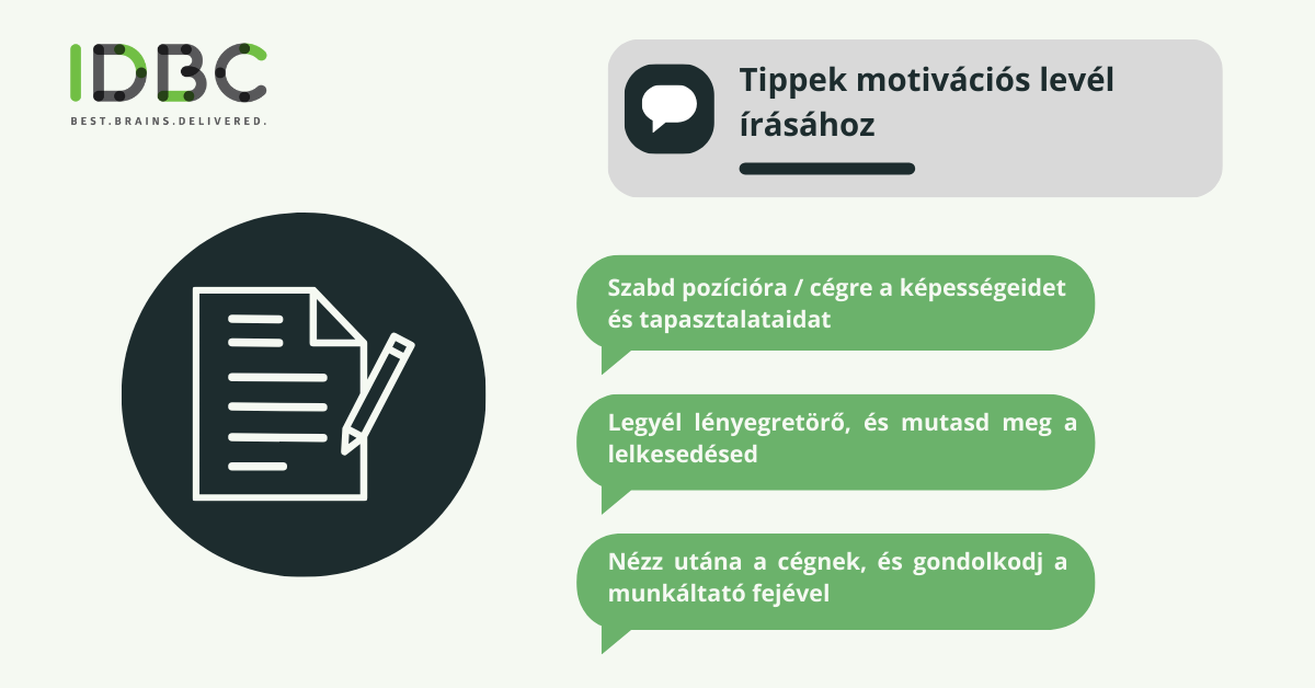 A motivációs levél célja, hogy kiegészítse az önéletrajzod, bemutatva a releváns szakmai tapasztalatod, elköteleződésed, céljaid és személyiséged. A jó motivációs levél segíthet kitűnni a tömegből, és közelebb hozhat álmaid állásához. Egy jól megírt motivációs levél őszinte, a meghirdetett pozícióra és cégre szabott, meghatározott szerkezetet követ. Fontos, hogy a levél tükrözze az egyéniséged, de ne legyen se túl laza, se kimért, mert így lesz igazán hatásos és értékes.