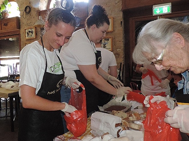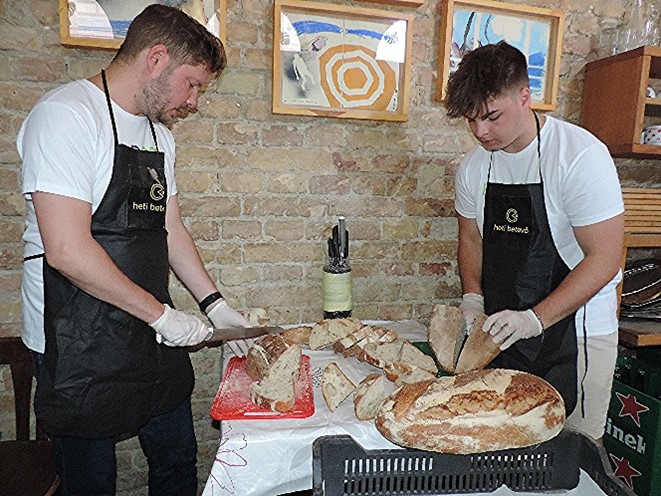 A szervezés folyamata nagyon gördülékenyen ment. A csomagolás helyszíne ezúttal is a Kisüzem volt, ahol egy nagyon jókedvű társaság fogadott minket, és egy rövid eligazítás után szinte rögtön munkába is álltunk. Néhány kollégánk a boltban kezdte, ahonnan szalvétával, gyümölcsszörppel és rengeteg banánnal tértek vissza. Mások kenyérszeletelésben vettek részt. Addig a többiekkel a csomagok összeállítását készítettük elő az édes és sós süteményeket kiporciózásával. Az IDBC kollégái számára ezúttal is nyitva állt a lehetőség, így aki szeretett volna, maga is hozzá tudott járulni egy kis süteménnyel és gyümölccsel az ebédhez. Volt áfonya, banán és alma, valamint frissen sült kakaós csiga és sajtos pogácsa, de a szervezők nagyon megörültek a palacsintának is. Mint kiderült, ez az egyik legnépszerűbb desszert, amiből szinte lehetetlen eleget sütni.