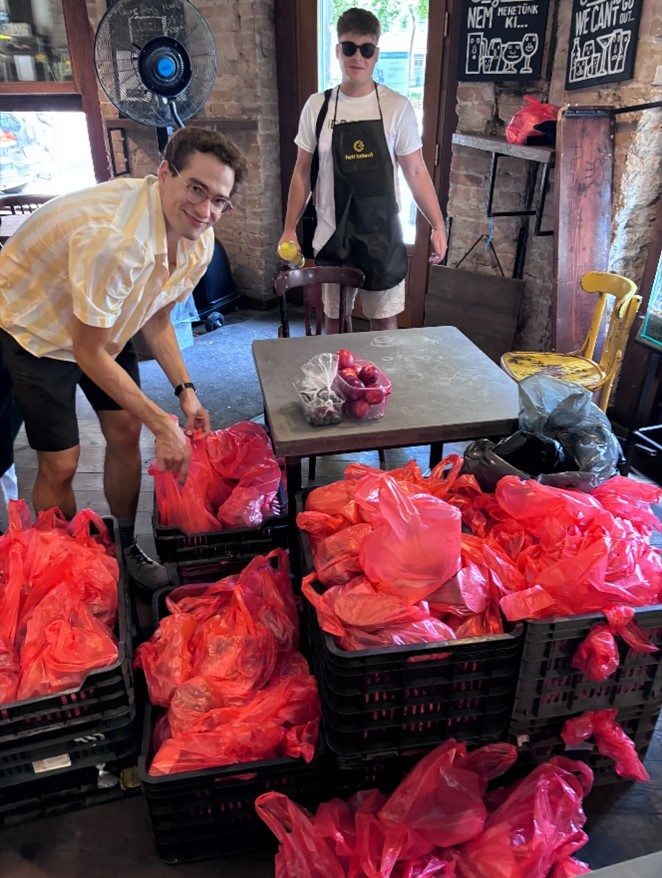 A munka oroszlánrésze viszont ezután következett. A folyamatban lévő felújítási munkák miatt az ételosztás továbbra sem a Klauzál téren történik. Az előkészített ételcsomagokat, gyümölcsöket és az előre ledobozolt főtt ételt – ami ezúttal székelykáposzta volt – egy önkéntes autóval szállította a Kisüzemtől néhány utcányira lévő belső udvarra, ahol már fel voltak állítva az asztalok és padok. Itt kezdtük meg a kipakolást, majd néhány perccel később meg is érkezett a sor eleje.