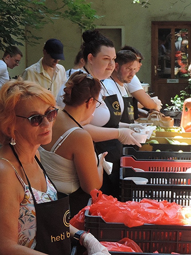 A legjobb rész ez után következett. Többeknek volt lehetősége kiválasztani, hogy almát, barackot vagy banánt szeretnének az ebéd mellé kapni. Az Egyesület önkénteseitől megtudtuk, hogy ez mennyire nagy dolog a hátrányos helyzetű emberek életében, hiszen a legtöbbeknek a hétköznapok során nem jut választási lehetőség. A sort végül egy újabb kis süteménnyel és hideg gyümölcsszörppel zárhatták. Utóbbinak különösen örültek a nagy hőségben. Néhányukkal volt alkalmam ételosztás közben szót váltani, ők személyesen is köszönetet mondtak a munkánkért.