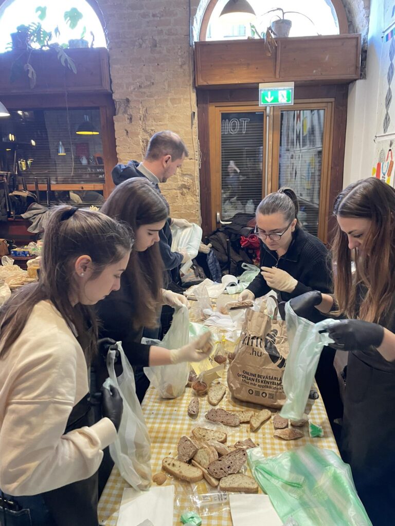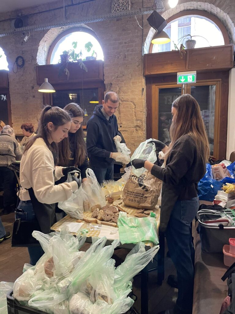 Az ételosztást megelőzően természetesen össze kellett állítanunk az ételcsomagokat, hiszen a meleg főétel és gyümölcs mellett, sütemény, pékáru, illetve evőeszköz és szalvéta is került a csomagokba. Így minden önkéntesnek hamar lett feladata. Volt, akik a kenyerek felszeletelését végezték, míg mások süteményt csomagoltak, többen pedig a csomagok összeállításáról gondoskodtak. Mindezen túl a hideg időre való tekintettel forró teát is készítettünk. Feladat tehát volt bőven. Azonban, mindenki nagyon lelkes volt már az előkészítő munkálatokban is. Aki szeretett volna, otthon készített házi süteményekkel is hozzájárulhatott a kezdeményezéshez, így érkezett brownie, csokis muffin, rétes és még sok egyéb finomság.